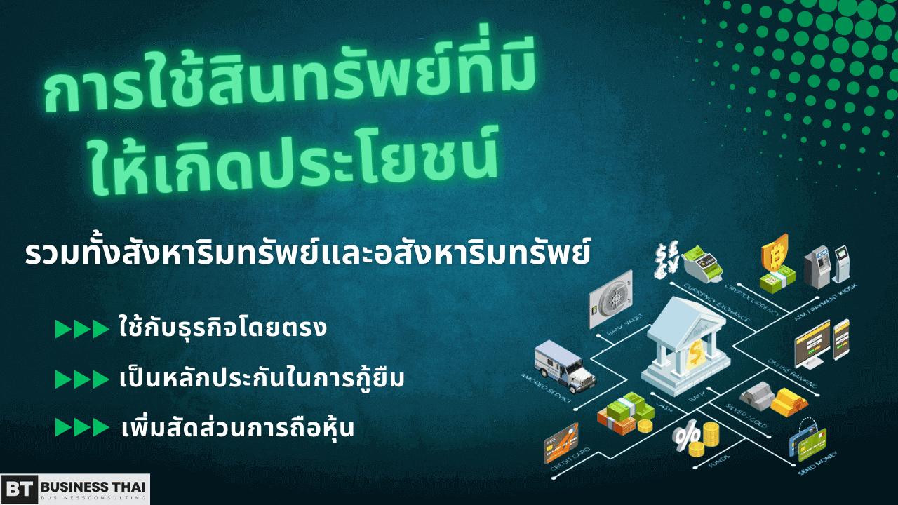 สินทรัพย์ที่คุณเป็นเจ้าของอยู่ทั้งสังหาริมทรัพย์และอสังหาริมทรัพย์สามารถนำมาใช้ประโยชน์กับธุรกิจได้ ไม่ว่าจะนำมาใช้โดยตรง ใช้เพื่อเป็นหลักประกันในการกู้ยืม หรือใช้เพื่อเพิ่มสัดส่วนในการถือครองหุ้น