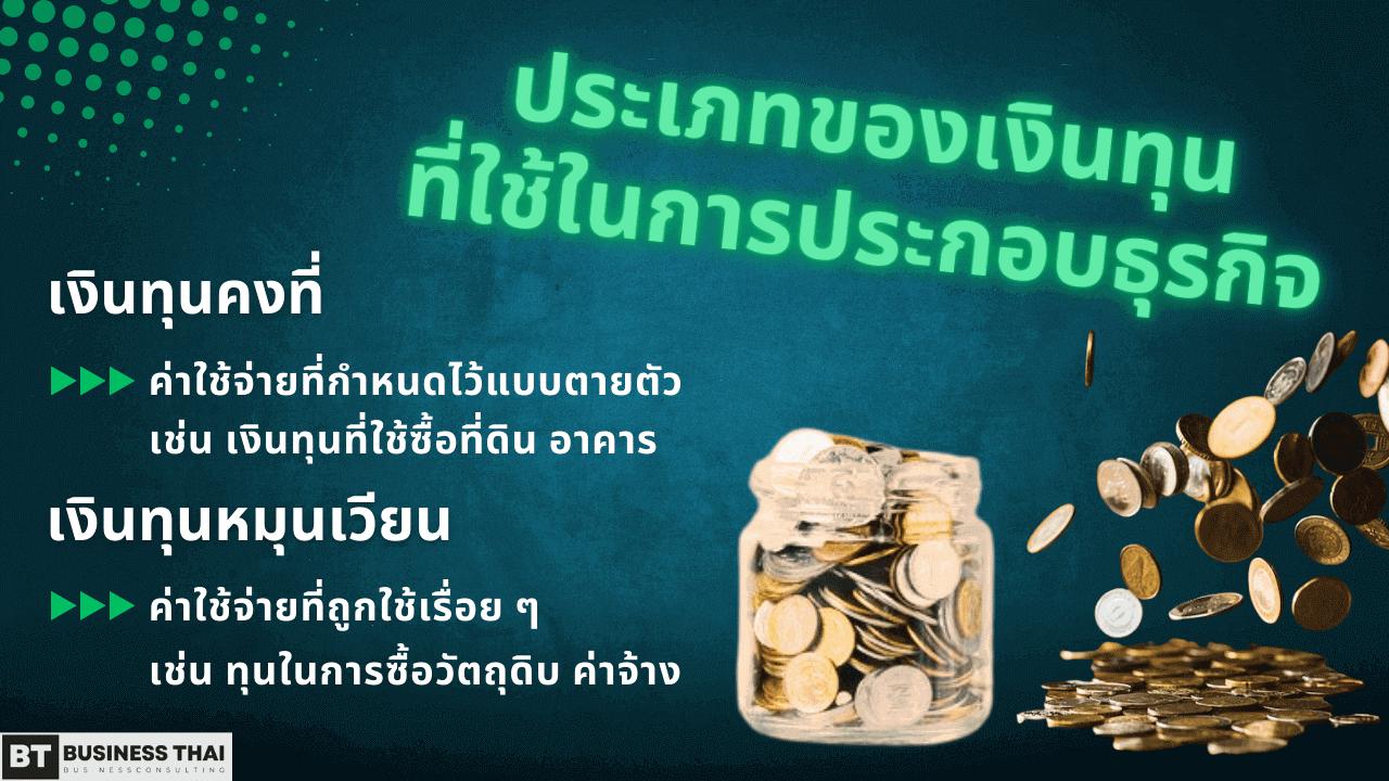 ประเภทของเงินทุนสามารถแบ่งออกมาได้เป็น เงินทุนคงที่ คือค่าใช้จ่ายที่ถูกกำหนดมาแบบตายตัว และเงินทุนหมุนเวียน คือค่าใช้จ่ายที่จะต้องจ่ายไปเรื่อย ๆ ระหว่างดำเนินกิจการ