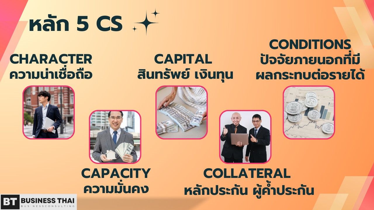 หลัก 5 Cs ที่ทางธนาคารและสถาบันการเงินต่าง ๆ ใช้ในการพิจารณาอนุมัติสินเชื่อจะมีตั้งแต่ความน่าเชื่อถือ ความมั่นคงและความสามารถในการชำระหนี้ สินทรัพย์ ทรัพย์สิน เงินลงทุนของธุรกิจ หลักประกัน ผู้ค้ำประกัน และยังพิจารณาไปจนถึงปัจจัยภายนอกต่าง ๆ ที่อาจมีผลกระทบต่อรายได้ของธุรกิจด้วย