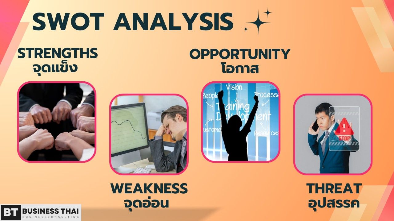 SWOT Analysis จะเป็นการวิเคราะห์ทั้งธุรกิจของคุณ ธุรกิจคู่แข่ง และวิเคราะห์ตลาด โดยจะต้องมองให้เห็นจุดแข็ง จุดอ่อน โอกาส และอุปสรรคในการทำธุรกิจภายในตลาดนั้นออกมาอย่างรอบคอบ