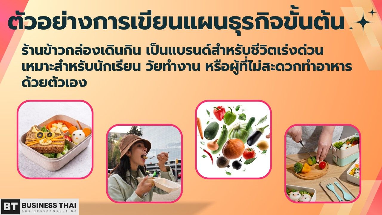 ตัวอย่างการเขียนแผนธุรกิจขั้นต้นที่จะแนะนำนั้นเป็นร้านข้าวกล่องเดินกิน ซึ่งเป็นแบรนด์ที่ตอบโจทย์ชีวิตเร่งด่วนด้วยอาหารกล่องเพื่อสุขภาพอย่างง่าย ๆ โดยมีกลุ่มเป้าหมายเป็นนักเรียน นักศึกษา และกลุ่มคนวัยทำงานที่ไม่สะดวกทำอาหารด้วยตัวเอง