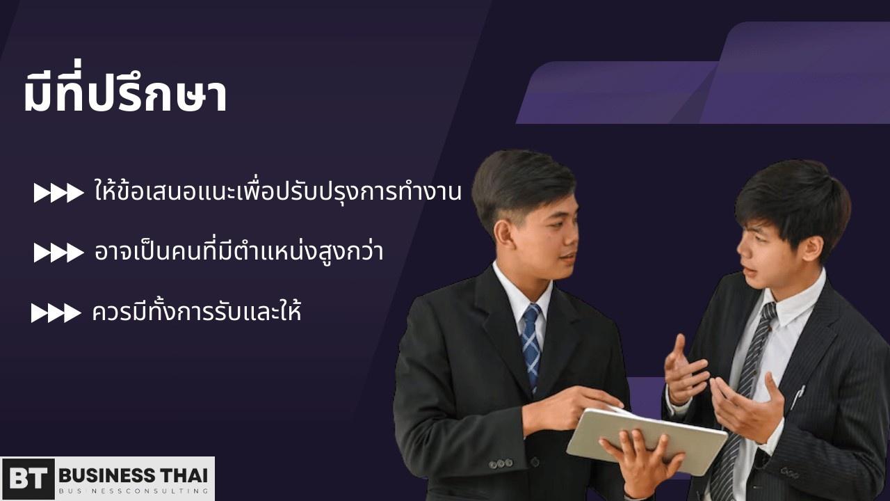 ที่ปรึกษาในที่นี้อาจเป็นได้ทั้งผู้ชี้แนะแนวทางในการทำงาน ผู้ที่ช่วยปรับทัศนคติ หรือแม้แต่ผู้ที่ช่วยเป็นกระจกสะท้อนให้เห็นภาพการทำงานของตัวเอง ช่วยให้ข้อเสนอแนะเพื่อนำไปปรับปรุงการทำงาน เพราะบางเรื่องคุณจะมองไม่เห็นตัวเอง ถ้ามีที่ปรึกษาที่ดีก็จะช่วยให้การทำงานของคุณมีศักยภาพมากขึ้น และยังมีกำลังใจในการทำงานเพิ่มขึ้น