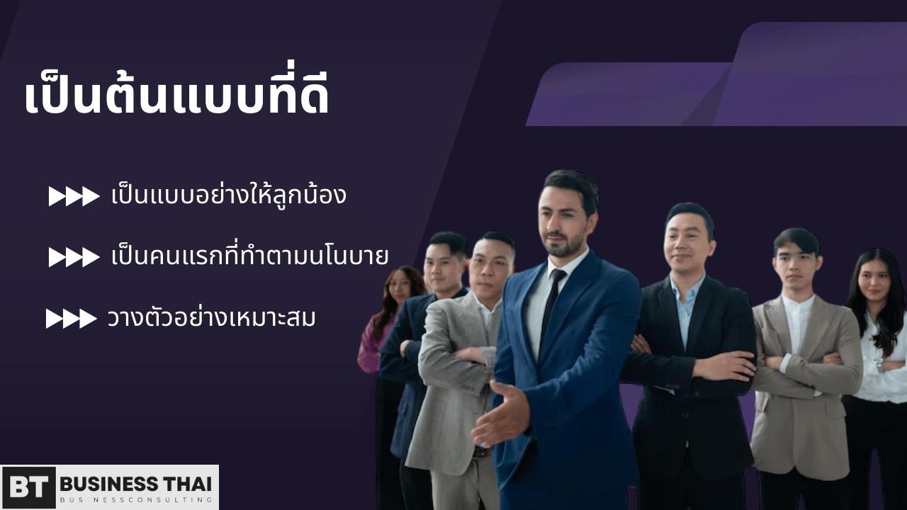 การเป็นต้นแบบที่ดีจะทำให้ลูกน้องซึมซับความตั้งใจในการทำงานได้ ดังนั้นผู้จัดการจะต้องเป็นคนแรกที่ทำตามนโยบายขององค์กรให้ลูกน้องเห็น ต้องวางตัวอย่างเหมาะสม และชักชวนให้ลูกน้องทำตามแบบอย่างที่สร้างเอาไว้
