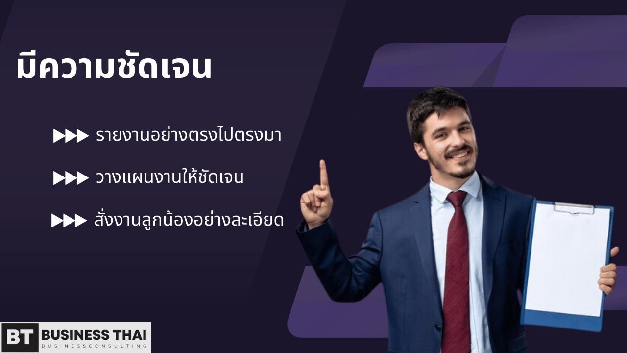 ความชัดเจนในฐานะผู้จัดการคือจะต้องวางเป้าหมายงานโดยคำนึงถึงนโยบายองค์กรเป็นหลักและสั่งการให้ลูกน้องทำตามแผนนั้นได้อย่างละเอียด